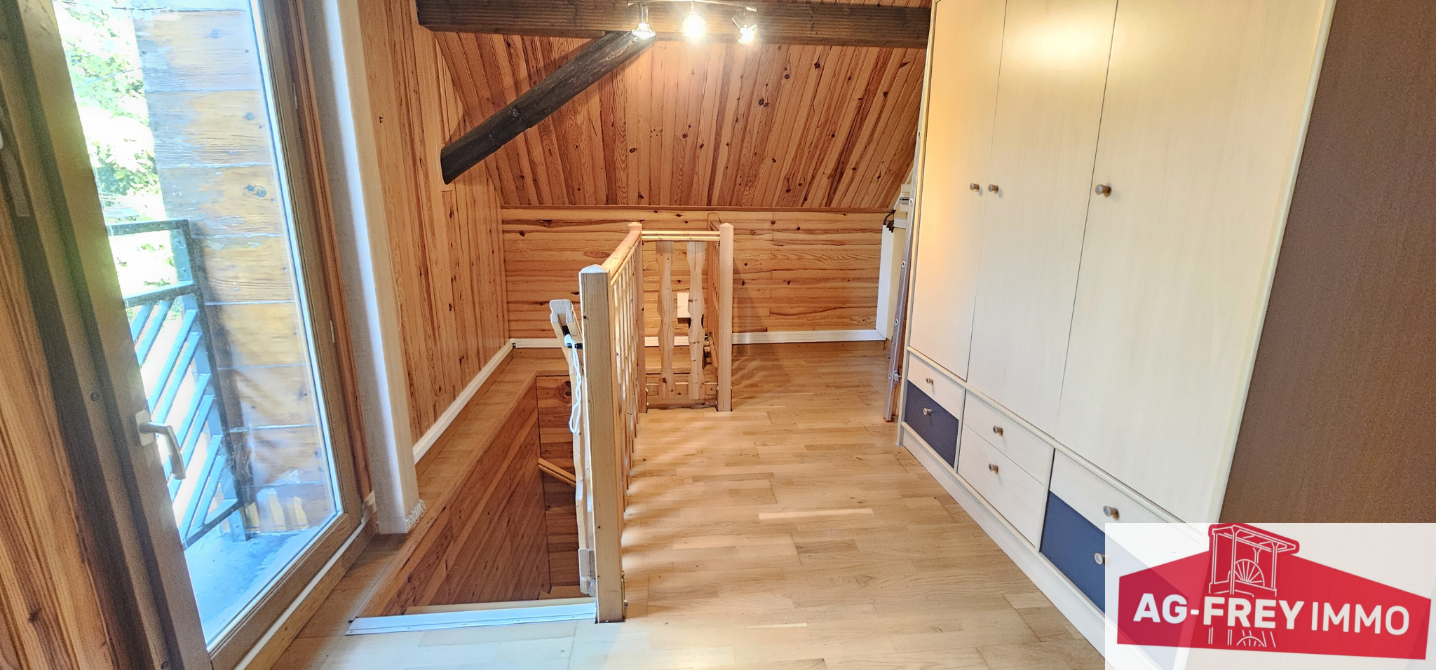 A l'étage une chambre à coucher et un espace bureau.